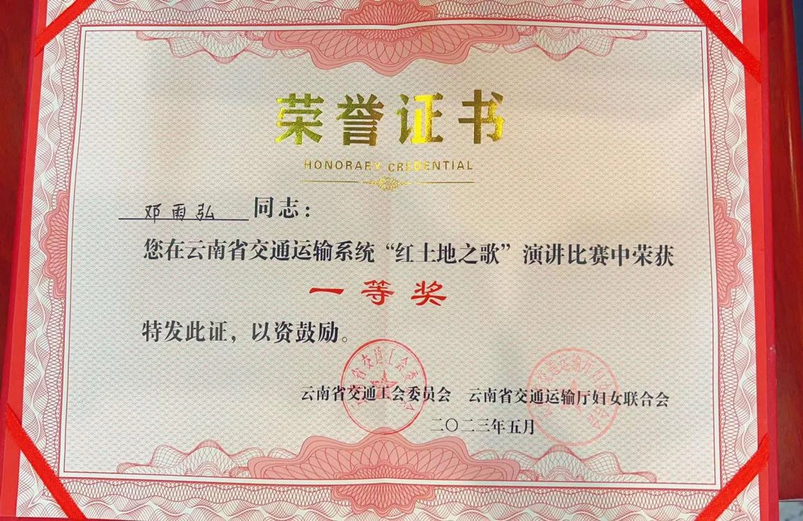 本次演講比賽由省交通工會和省交通運輸廳婦女聯(lián)合會主辦,來自全省交通運輸系統(tǒng)的32名優(yōu)秀選手參加角逐,講述了全省交通系統(tǒng)干部職工在基層一線和本職工作崗位上做出突出成績和可歌可泣的感人故事。鄧雨弘在演講中以思念去世的奶奶為情感主線,回顧了老家從“沒有路”到有了農(nóng)村公路,再到四通八達的高速路的歷史變遷過程,講述了自己在本職崗位上參加高速公路建設(shè)的經(jīng)歷,抒發(fā)了自身兢兢業(yè)業(yè)、默默耕耘建設(shè)交通強國的豪邁氣概,給觀眾和評委留下了深刻印象,最終獲得了一等獎。