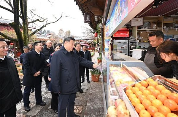 麗江古城有800多年歷史,被列入世界文化遺產(chǎn)名錄。一場春雪過后,麗江游人如織。習近平來到這里,詳細了解古城營建歷史、納西族民居特色和當?shù)匚幕z產(chǎn)保護利用、推動文旅融合發(fā)展等情況。居民和游客見到總書記十分興奮,爭相問好,有的還彈奏樂器、載歌載舞歡迎總書記。習近平頻頻與大家互動交流,了解商鋪經(jīng)營狀況和游客感受。他要求當?shù)靥幚砗帽Wo和發(fā)展的關(guān)系,讓這座美麗的古城煥發(fā)新的光彩。